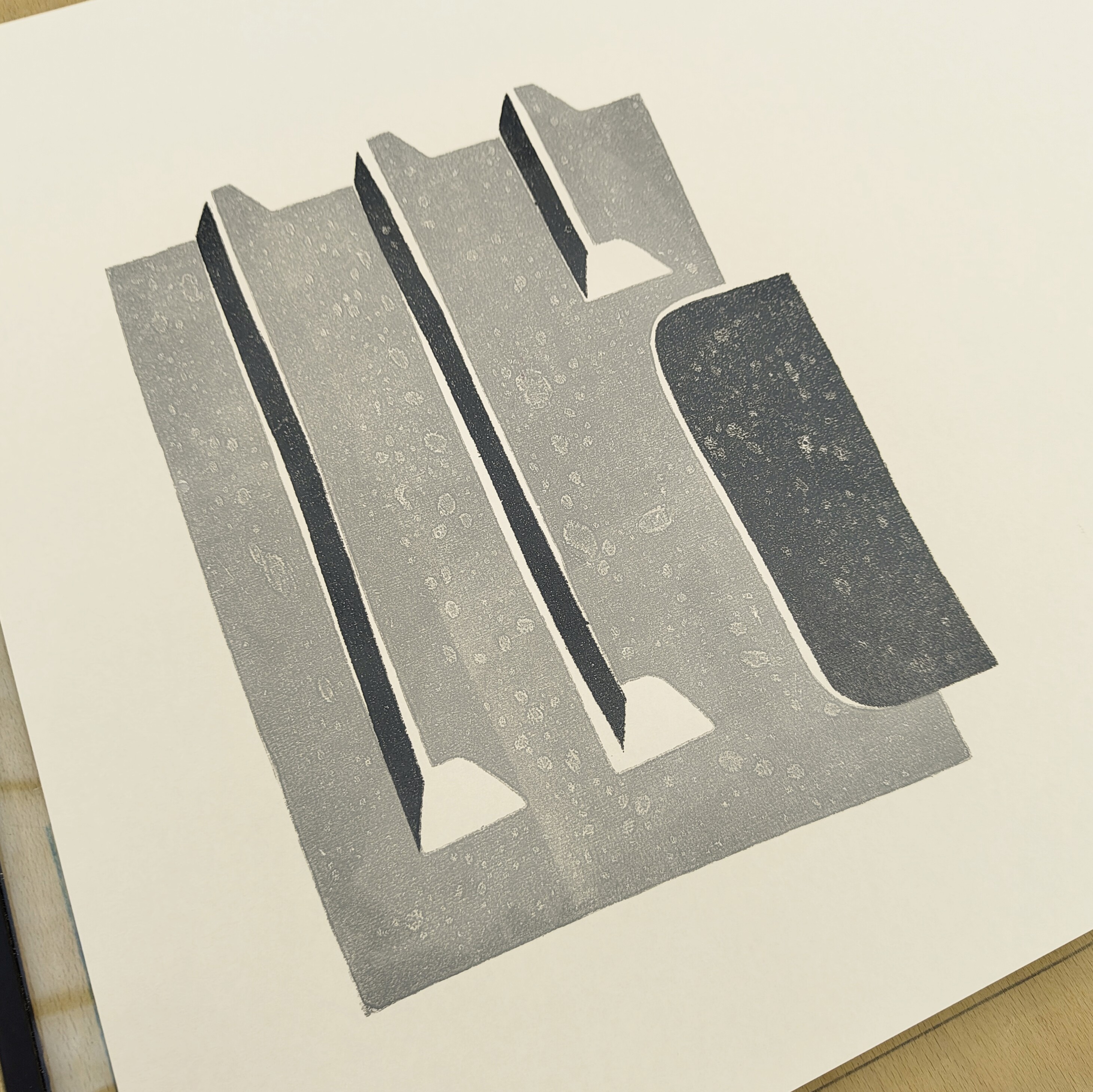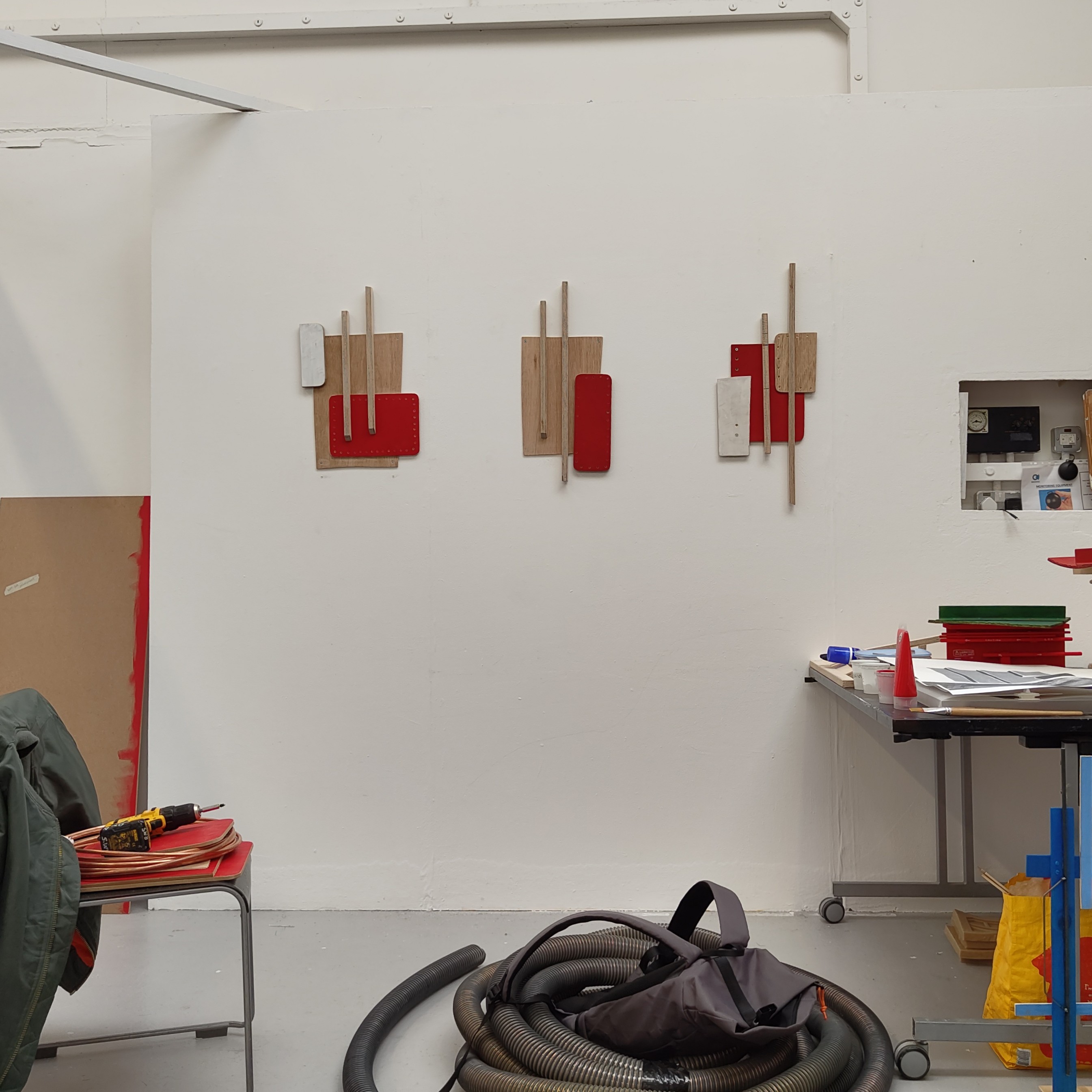 Wall relief panels in studio space (2024. Plywood, MDF, acrylic paint)